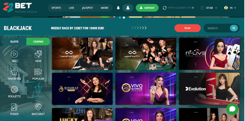 ARE THERE LIVE BLACKJACK GAMES AT 22BET INDIA?